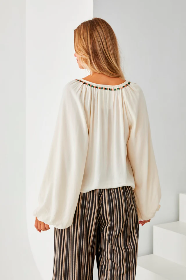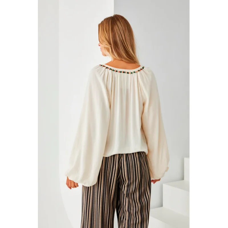 Blusa de mangas abullonadas. Escote anudado con pompones. Detalle de motivos bordados en contraste.