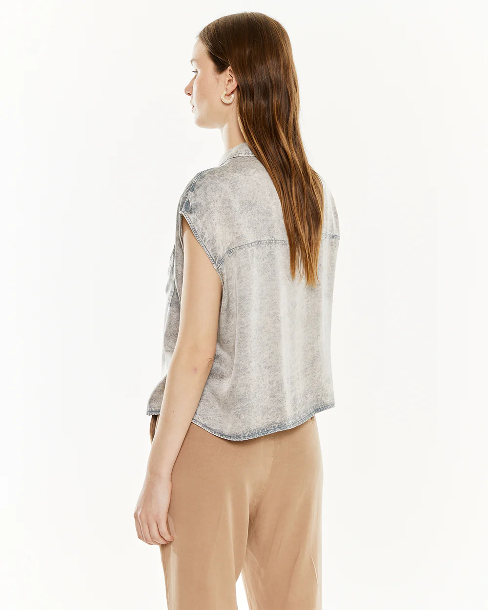 Camisa de mujer sin mangas, con cuello camisero, bolsillos plastrón en el delantero, cierre con botones y tintura en corrosivos. Prenda sostenible.