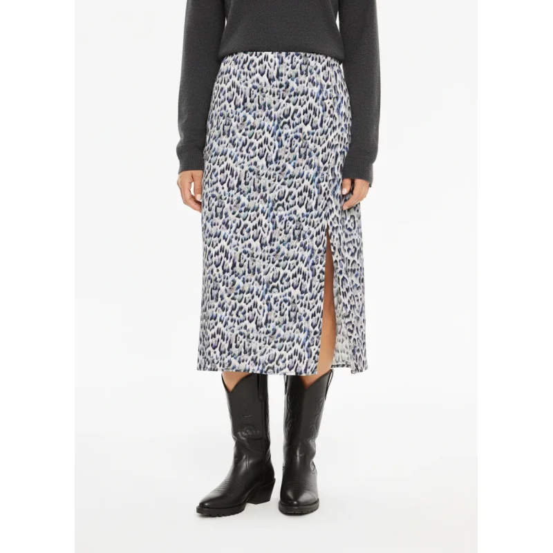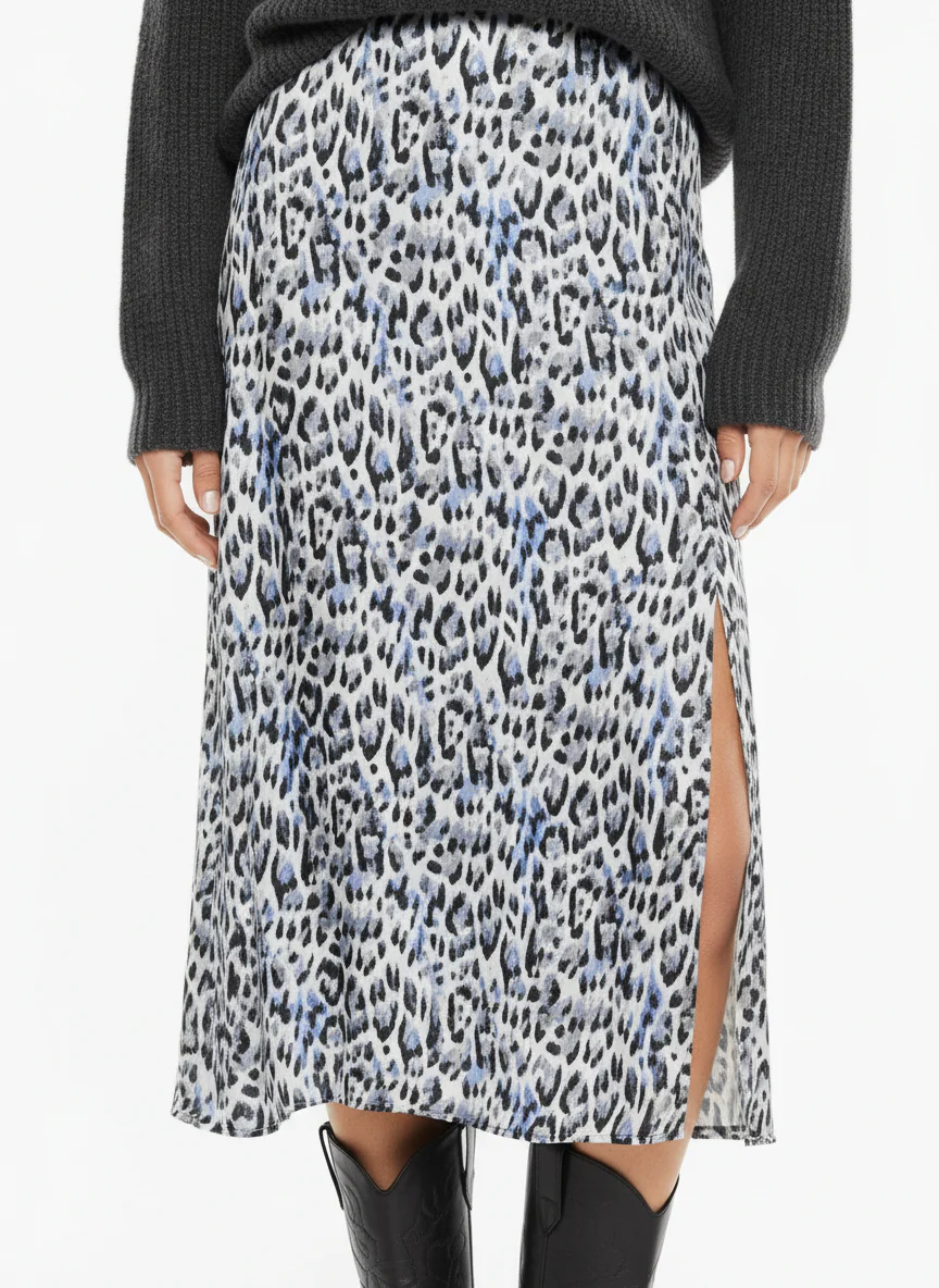 Falda midi de mujer, con estampado animal print, detalle de frunce en el delantero y abertura. Prenda sostenible.