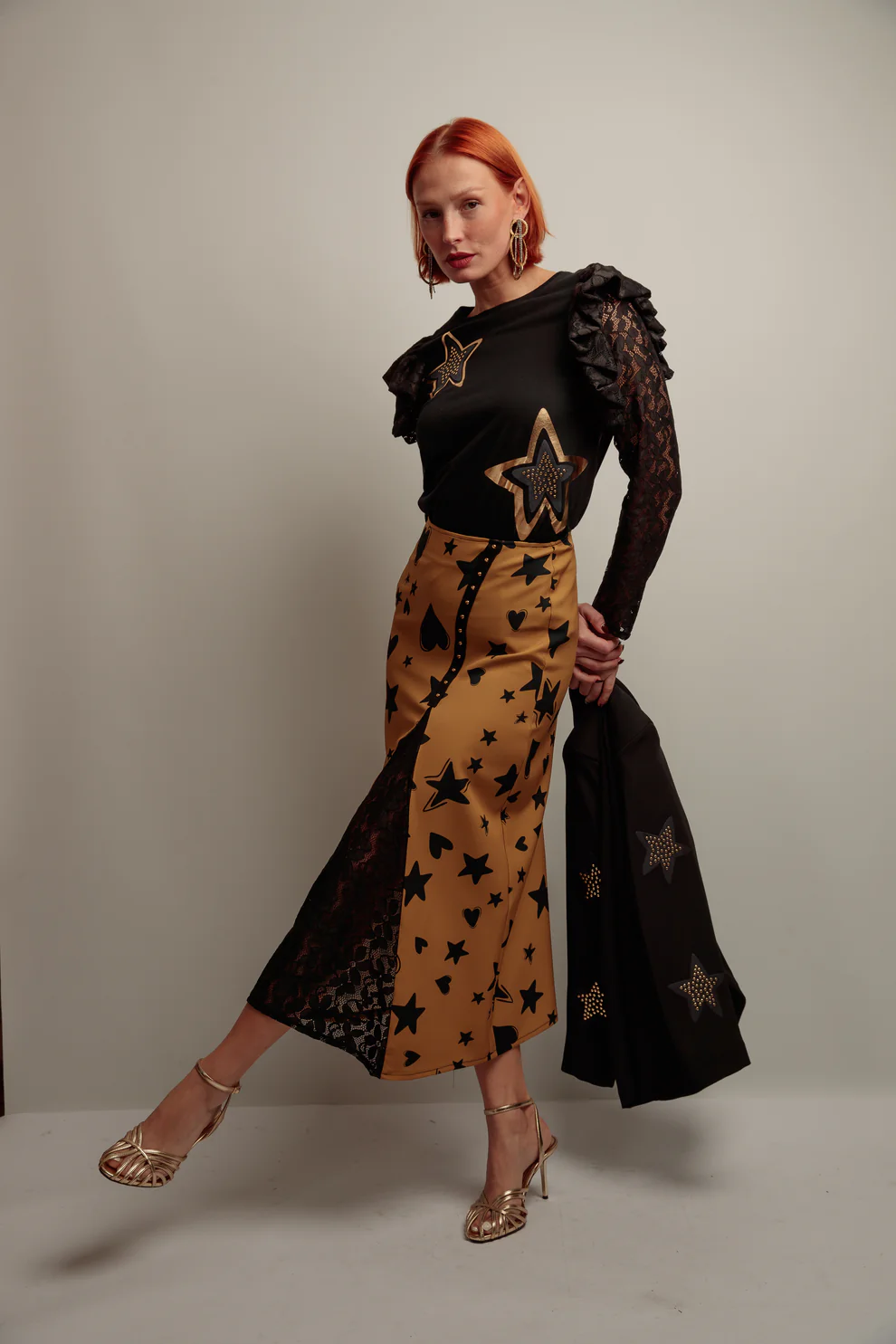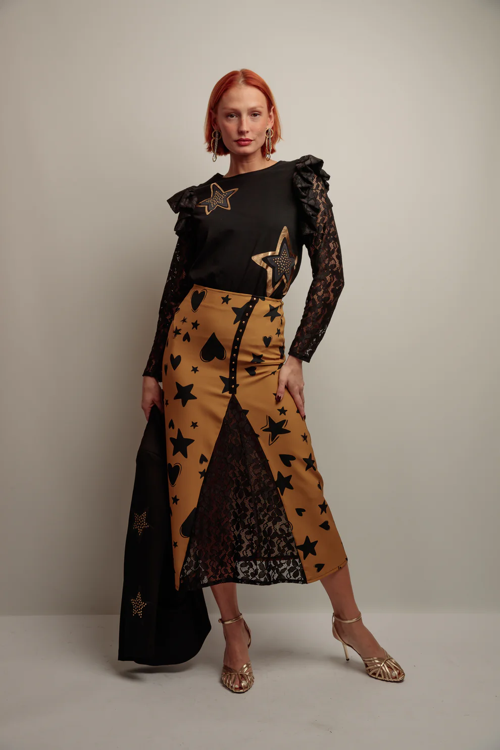 Falda larga de mujer confeccionada con dos tejidos, sin cinturilla para una mejor adaptacion a la silueta. Cierre con cremallera oculta en la parte posterior. Detalle de tachuelas en color dorado en el frontal. La falda tiene abertura frontal adornada con encaje.