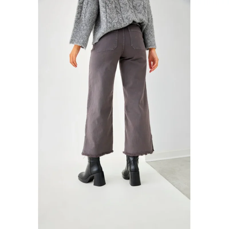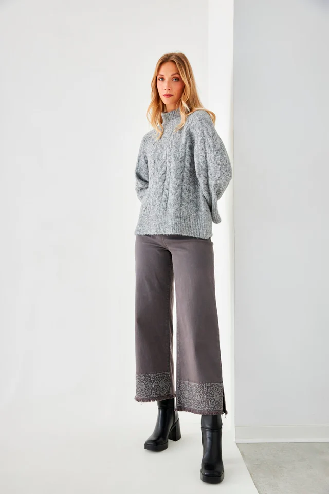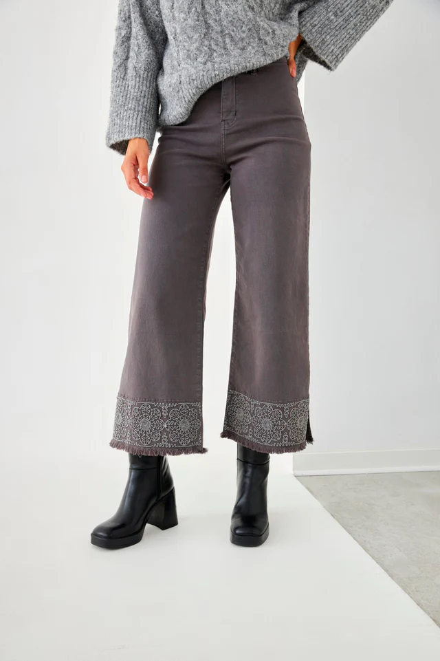 Pantalón en tejido denim de tiro medio con bajos acampanados detalle bordado en el bajo. Cierre de botón y cremallera.