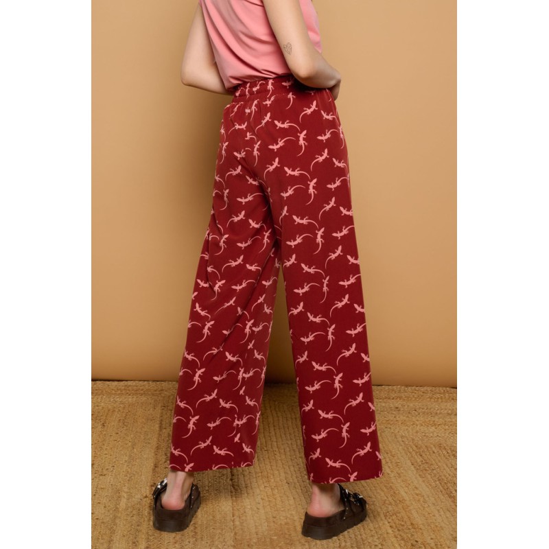Pantalón de silueta fluida y pierna ancha. Cintura elástica con cordón ajustable. Estampado de lagartijas en color rosa sobre fondo granate. Tejido ligero.