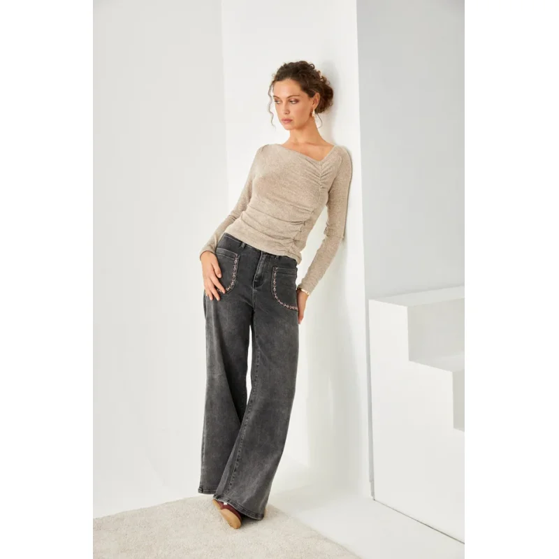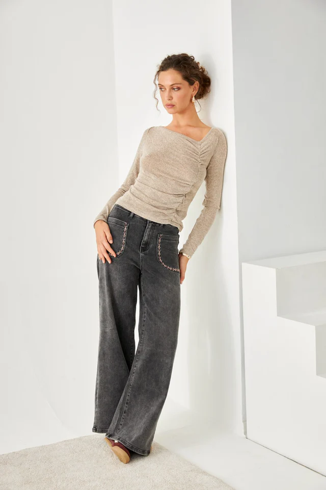 Top asimétrico de punto fino en manga larga y escote redondo con fruncido en un lateral.