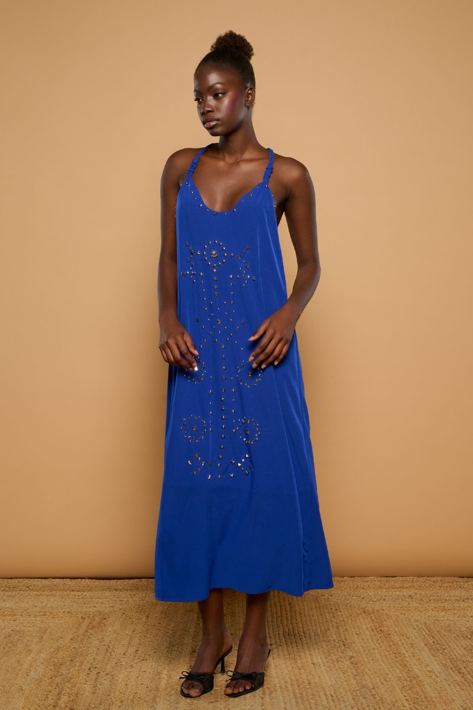 Vestido largo de escote en pico y tirantes finos. Detalle de aplicación de tachuelas metálicas en el escote y