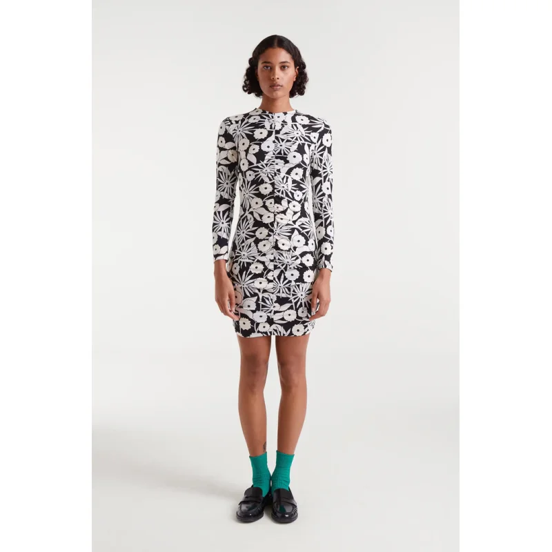 Vestido corto con tejido punto estampado Tofu. Con cuello redondo y manga larga.