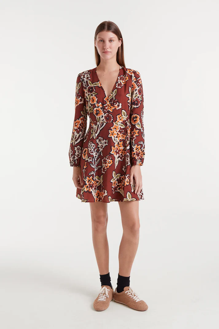 Vestido corto de crepé ligero con estampado Daisy. Cuello pico y manga larga envolvente. La modelo mide 177 cm y lleva la talla S.