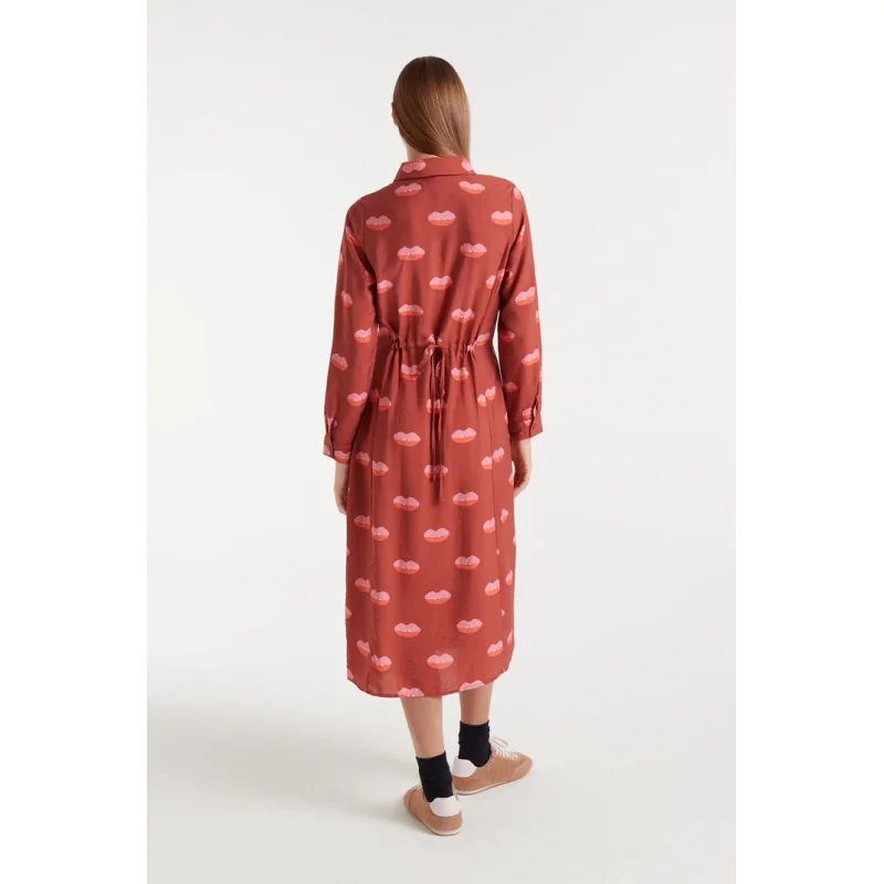 Vestido midi con estampado Lips. Con cuello solapa y manga larga terminada en puño con botón.