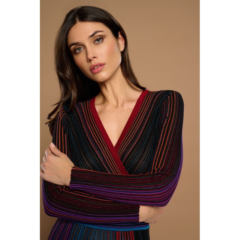 Vestido largo de escote en pico y manga larga. Ajustado en cintura. Falda con vuelo. Tejido elástico.