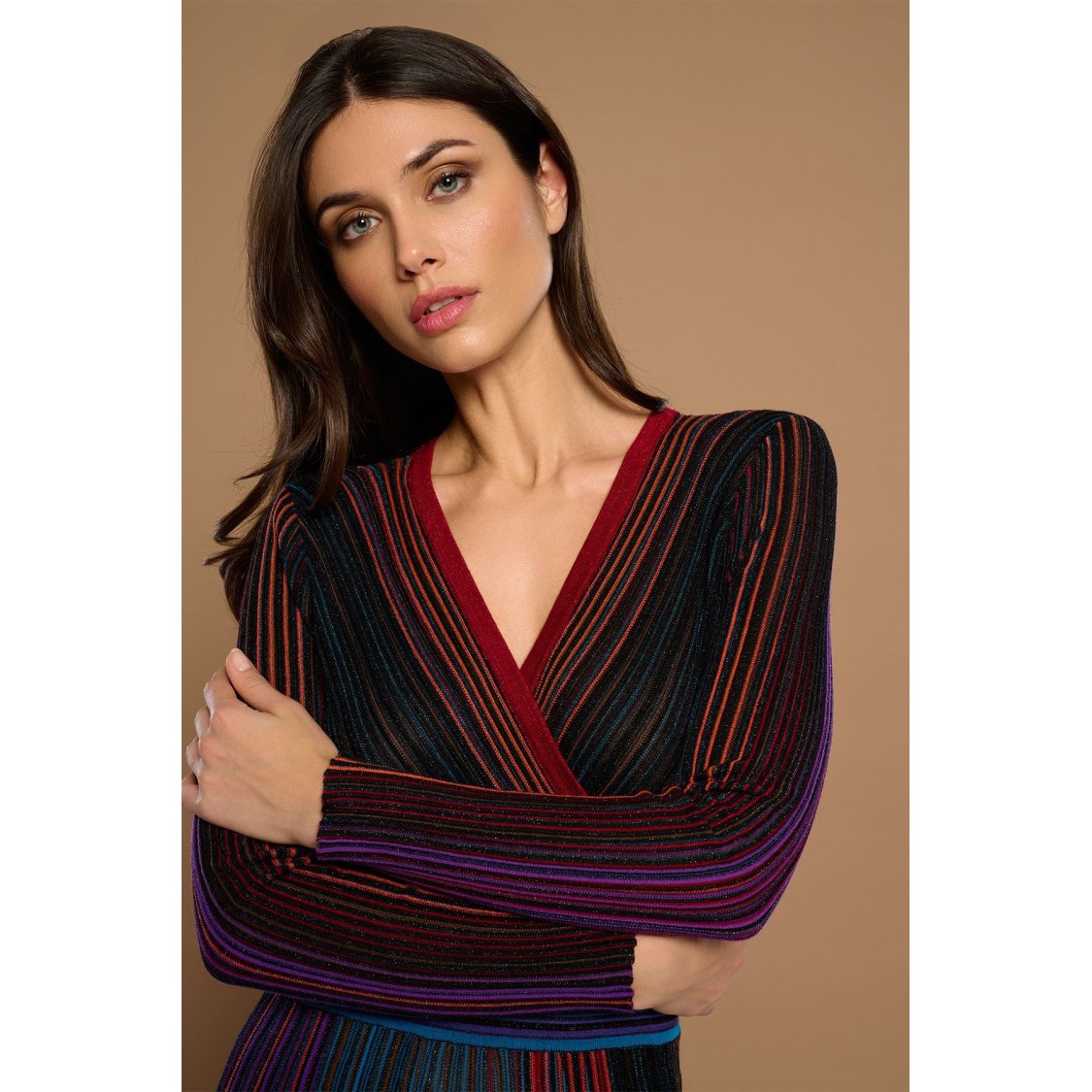 Vestido largo de escote en pico y manga larga. Ajustado en cintura. Falda con vuelo. Tejido elástico.